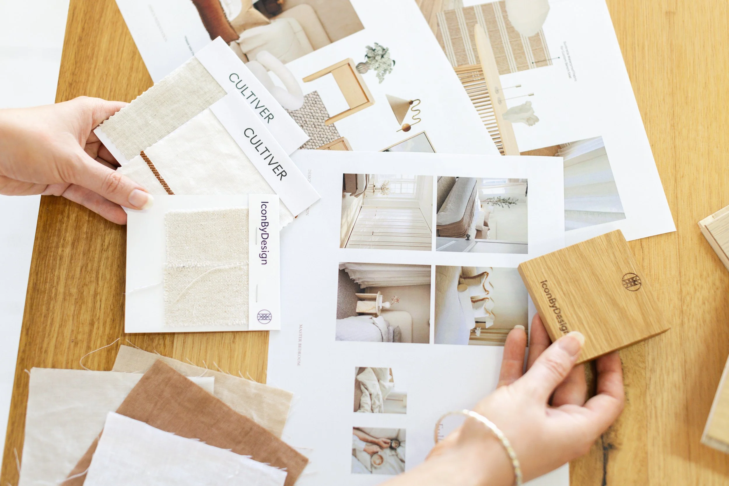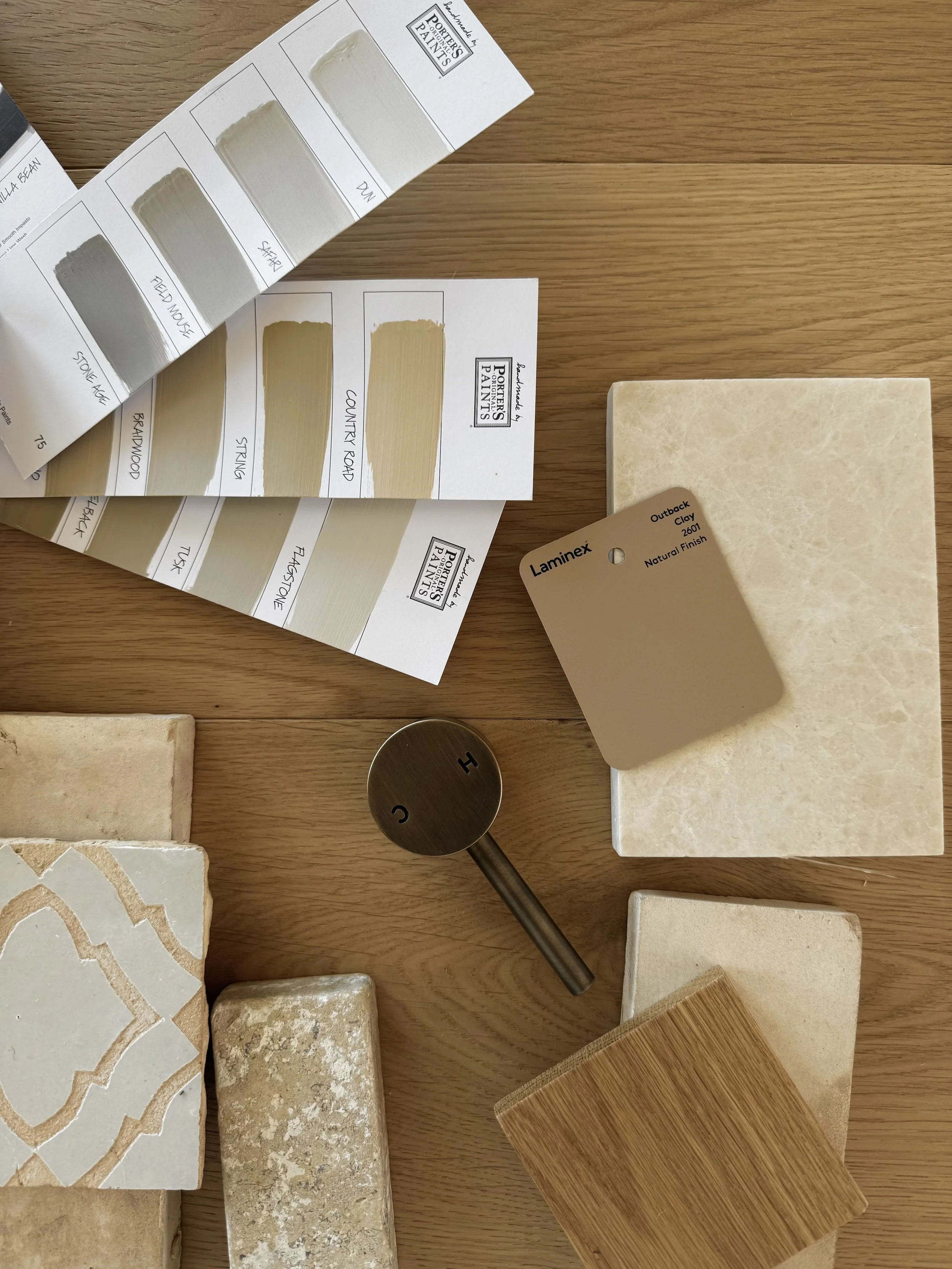 Client-provided physical samples (tiles, flooring, benchtops, finishes, colours, etc.) reviewed together